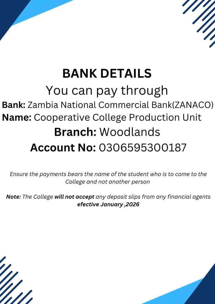 The College wishes to guide that all fees/charges to be paid to the College effective January,2026 must be paid through any registered bank. A stamped deposit slip should be presented and verified by accounts before a Government of the Republic of Zambia(GRZ) receipt is issued.The fees/Charges must be paid into the following account.